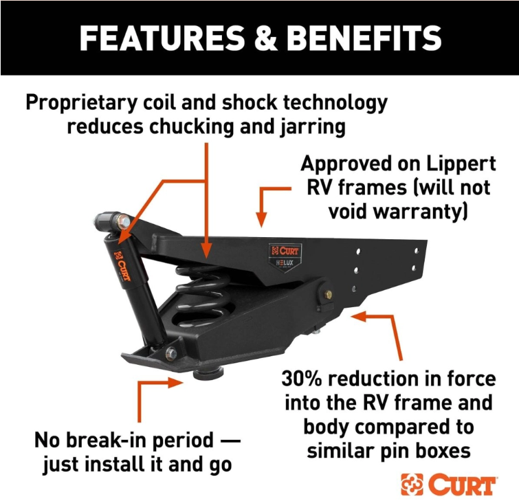The CURT Helux™ Coil-Spring 5th Wheel Pin Box delivers a new standard in towing comfort and control. Engineered with advanced coil-spring and shock absorber technology, it significantly reduces chucking, jarring, and bouncing for a smoother, more stable ride. By dampening road impact and vibration, it not only improves comfort for drivers, passengers, and pets but also helps protect your RV’s frame, hardware, and cargo.
