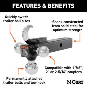 Hauling some yard waste to the city dump? Taking the family camping for the weekend? Pulling some heavy-duty equipment around the farm? If you own more than one trailer, you know what a hassle it can be switching back and forth between ball mounts and keeping track of which ball mount fits which coupler. CURT has made things simple with the multi-ball mount with tow hook. This all-in-one ball mount behemoth features three trailer balls with three different ball diameters and a tow hook for recovery towing. It allows you to easily accommodate multiple trailers and coupler sizes and fits any trailer hitch with a 2" x 2" receiver tube opening. For whatever trailer you are towing on any given day, the multi-ball mount makes it easy to hitch up and go. With three trailer balls on one shank, simply rotate the ball mount to the correct size ball, insert a hitch pin and you are ready to couple your trailer. There is no need to switch and store multiple ball mounts or to mount and torque different size trailer balls. The tow hook and all three trailer balls on the multi-ball mount are welded onto a solid steel shank, giving them a strong foundation and eliminating the possibility of coming loose or being stolen. The 1-7/8" trailer ball offers a gross trailer weight capacity of up to 3,500 lbs. and a tongue weight rating of 350 lbs. The 2" ball has a GTW capacity up to 5,000 lbs. and a TW rating of 500 lbs. The 2-5/16" ball can tow up to 10,000 lbs. of GTW and 1,000 lbs. of TW. With the added tow hook, the multi-ball mount is also the perfect accessory for recovering stuck vehicles or straight-line pulling various loads. The tow hook's capacity is limited to the trailer hitch's capacity. The CURT multi-ball mount comes with a durable black powder coat finish on the shank to help it withstand prolonged exposure to the elements, and it features two possible attachment lengths of 7" or 8-1/2".