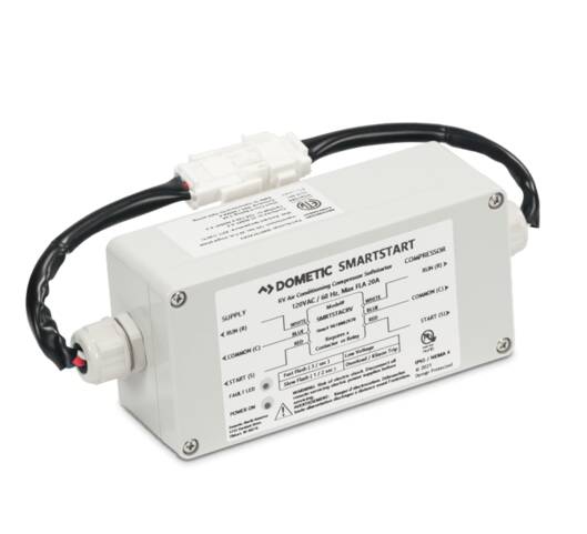 The Dometic SmartStart accessory for RVs is a soft starter that reduces AC start-up power demand by as much as 75%. This innovative device enables air conditioners to run on a generator as small as 2,000W, helping to eliminate the need for shore power and making boondocking easy. Specifically developed for RV air conditioners, it also makes it possible to use an inverter in a solar application without faulting. With the SmartStart AC Accessory, RV owners have the option of moving to a smaller generator, saving weight and money while enjoying quieter AC startups at any time of day or night.