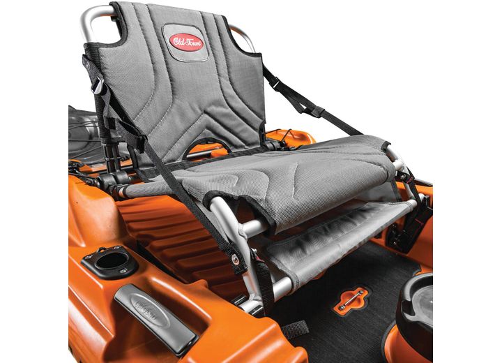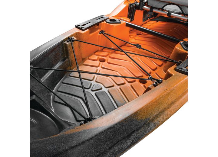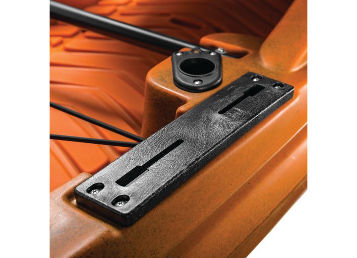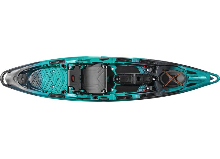 The Old Town Sportsman BigWater 132 Paddle Kayak is engineered above and below the waterline to be the perfect platform for fishing. At just over 13 feet, the performance tri-hull design provides the paddling efficiency essential in more open water and the stability required when you stand. A paddle clip mounted on the side of the hull keeps you paddle secure and out of the way while you fish. It has a molded paddle rest and a stand-up assist strap. Four accessory tracks on the forward hull, and two in the rear, provide easy on/off accessory mounting. The center console mod pod is the "Swiss Army Knife" of consoles. Hinged lids open to two cavernous, removable containers, perfect for stashing tackle boxes or bait. It includes accessory tracks, a cup holder, splash proof storage for phone/keys, and a magnetized hook and lure storage area. Additional tackle management features include retainer bungees in the bow, a large tank well in the stern, and a custom tackle box that stores under the Element seat. It has one forward-facing and two rear-facing flush mounted rod holders. Dry storage for additional gear is in the sealed bow hatch. Breathable, quick-drying, and fully adjustable, the Element seat provides the comfort needed to keep you on the water longer. Food braces adjust along a rail and snap lock into place, improving paddling performance and comfort. EVA Foam deck pads dampen sound for stealthy fishing adventures, and provided a comfortable surface for bare feet.